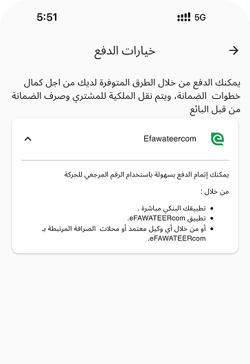 "يُستخدم حساب الضمان لحماية الطرفين (البائع والمشتري) عند بدء المعاملة، يقوم المشتري بتحويل المبلغ إلى حساب الضمان من نظام اي فواتيركم . و عند اتمام نقل الملكيه يتم صرف المبلغ للبائع من خلال فنوات الدفع المعتمده و في حال حدوث خلاف او تقديم طلب الغاء للضمانه يتم اعاده المبلغ للطرف المستفيد بعد التحقق من اتمام اجراءات الغاء الضمانه - راجع سياسه الارجاع "